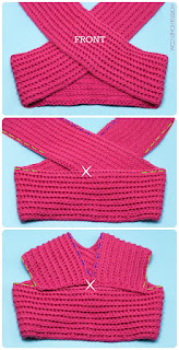 São 27 pontos na agulha, tecendo barra inglesa por 40 cm na cor rosa, e 40 cm na cor lilás. Depois é só prestar atenção na montagem.